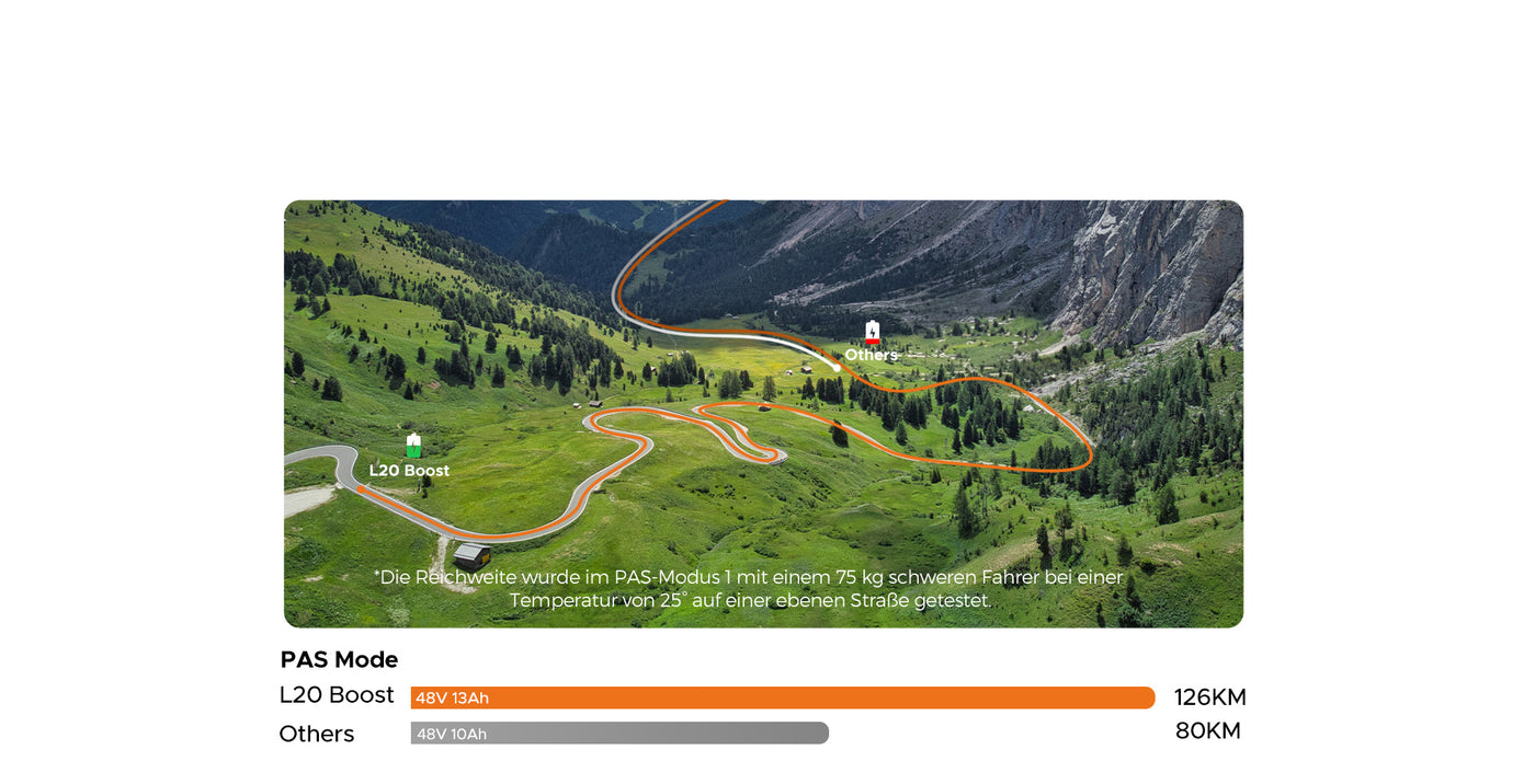 Bis zu 126 km (tatsächliche Entfernung variiert je nach Fahrergewicht und Straßenbedingungen)