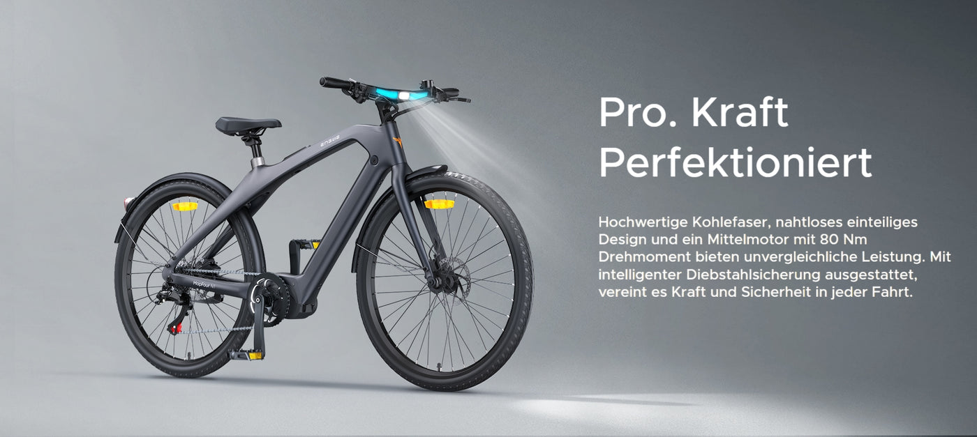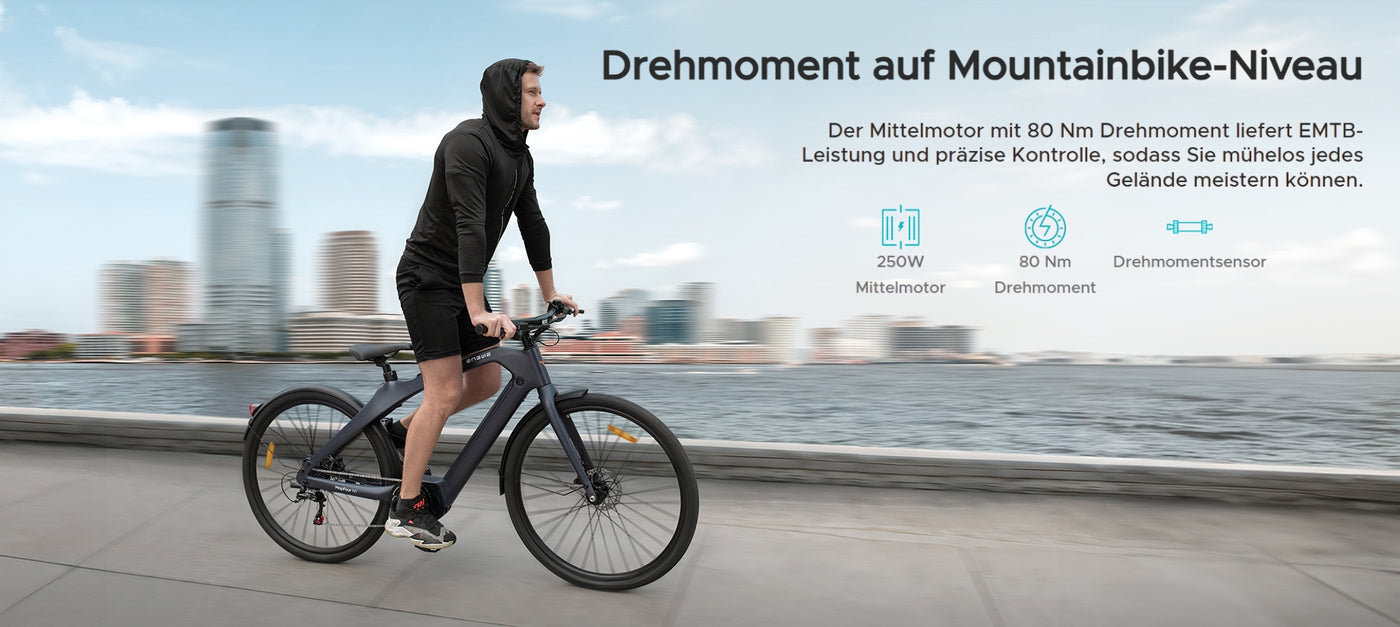 Mit einem leistungsstarken Mittelmotor und Drehmomentsensor meistert er mühelos Hügel und Stadtstraßen und sorgt für eine kraftvolle, geschmeidige Fahrt.